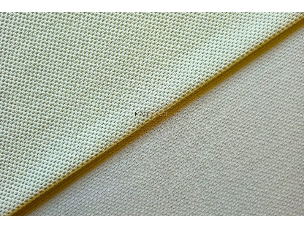 Elastická teplákovina (výplněk) s 3D strukturou v mintové barvě má rubovou vrstvu probarvenou tmavším odstínem, který zvýrazňuje 3D efekt na lícové straně. Jde o velmi příjemný materiál vhodný na mikiny, sportovní šaty, volnočasové oblečení, nákrčníky atd. Díky elastanu je vhodná i na přiléhavější oděvy.