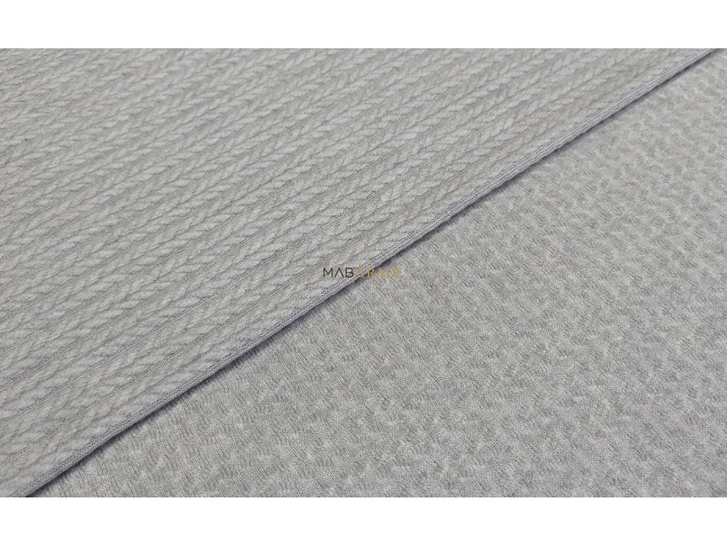 Lehký úplet s plastickým copánkovým vzorem ve světle šedém melíru ze směsi viskózy, polyesteru a nylonu má jemný povrch, který oceníte při šití čepic, šál, kardiganů, volnočasových mikin, roláků, šatů, kamaší a domácích kalhot. Copánkový úplet je možné použít při stříhání jak vodorovně tak svisle.