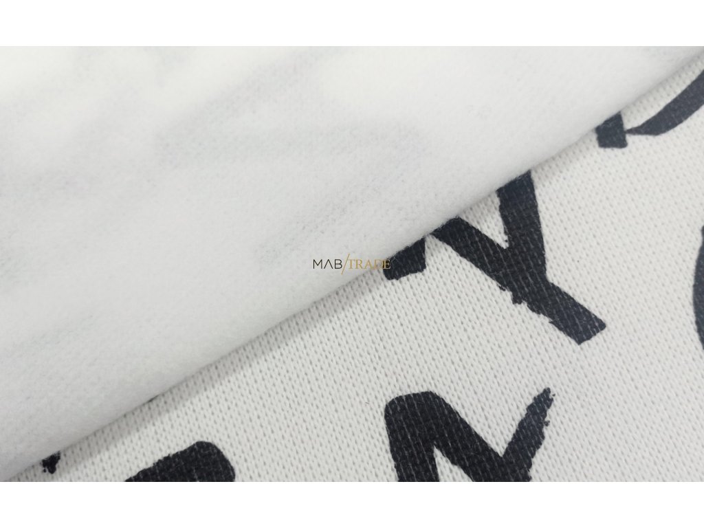 Svetrovina v bílé barvě s potiskem ručně psaných písmen, je příjemný a měkký materiál. Jak už název napovídá, je vhodná na svetříky, šaty, sukně, kabátky, bundičky, vesty ale také na šály a kardigany. Z rubové strany má krátce střižený počesaný chloupek podobný microfleecu, lícová strana je pletená hladce, materiál je lehce pružný.