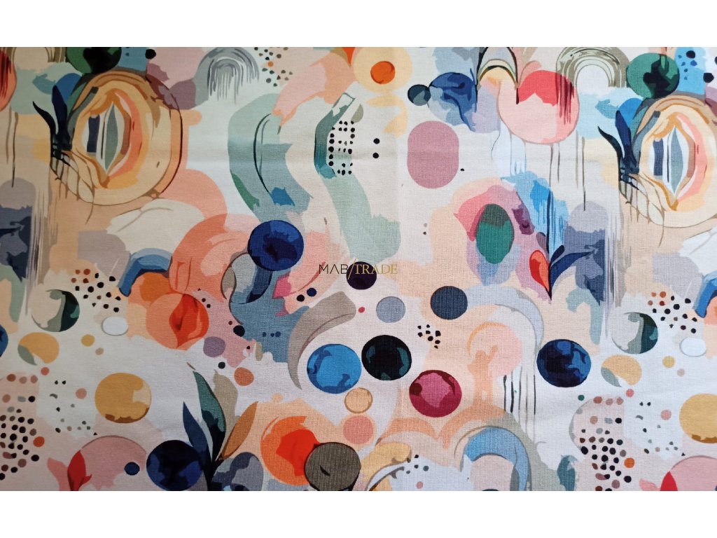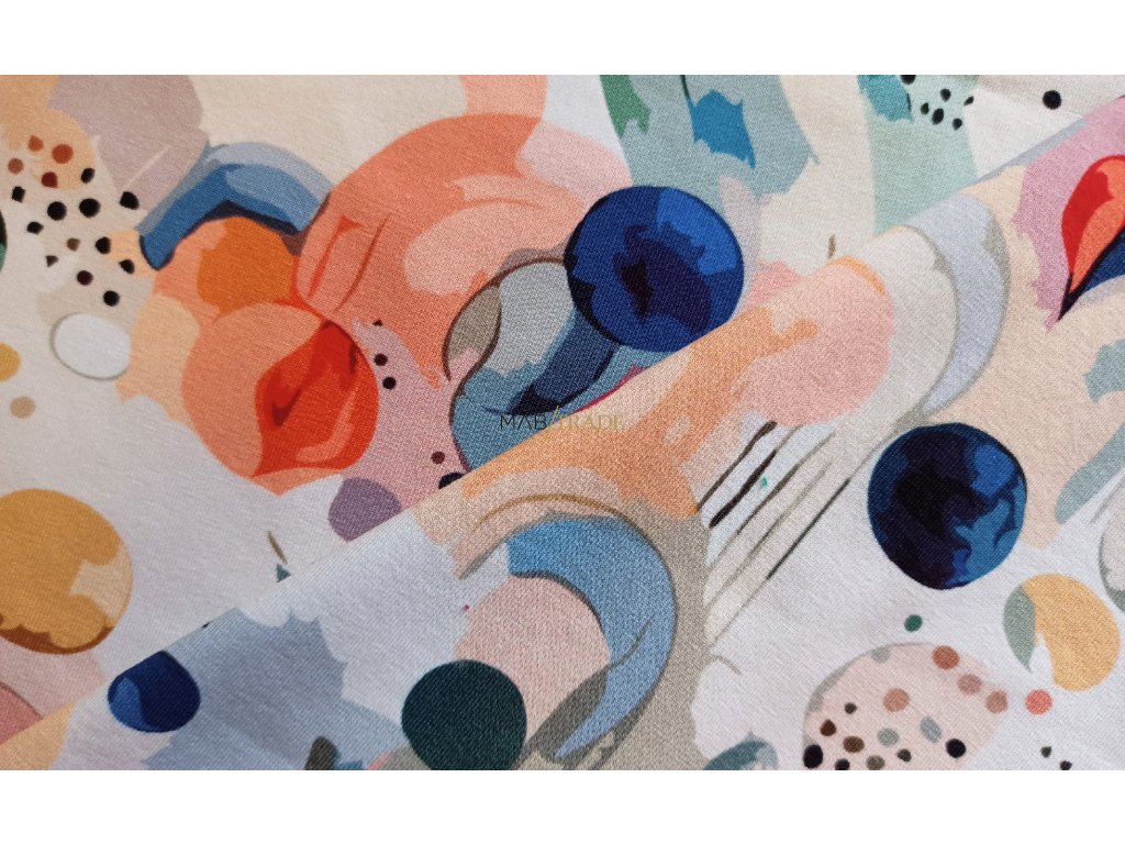 Úplet elastický jednolícní s digi tiskem Kuličky, je vhodný na trička, halenky, šaty, sukně, legíny aj. Díky elastanu dobře pruží a tím je vhodný i na přiléhavější oblečení, nevytahuje se a drží pěkně svůj tvar.