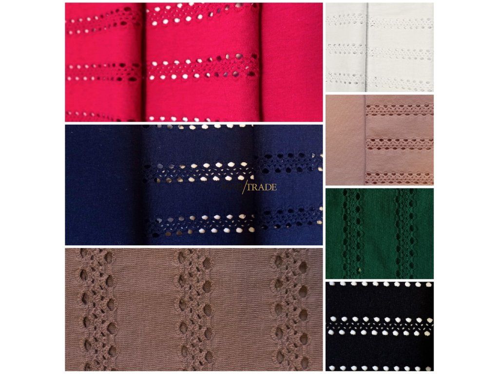 Madeirový úplet s dírkovanou výšivkou v pruzích je ideální pro letní dámskou a dětskou volnočasovou módu, ale své využití najde také při slavnostnějších příležitostech. Jemný madeirový vzor zjemní vyznění Vašeho outfitu a dodá mu lehkost. Prodyšnost kousků oblečení z tohoto materiálu je zaručena!